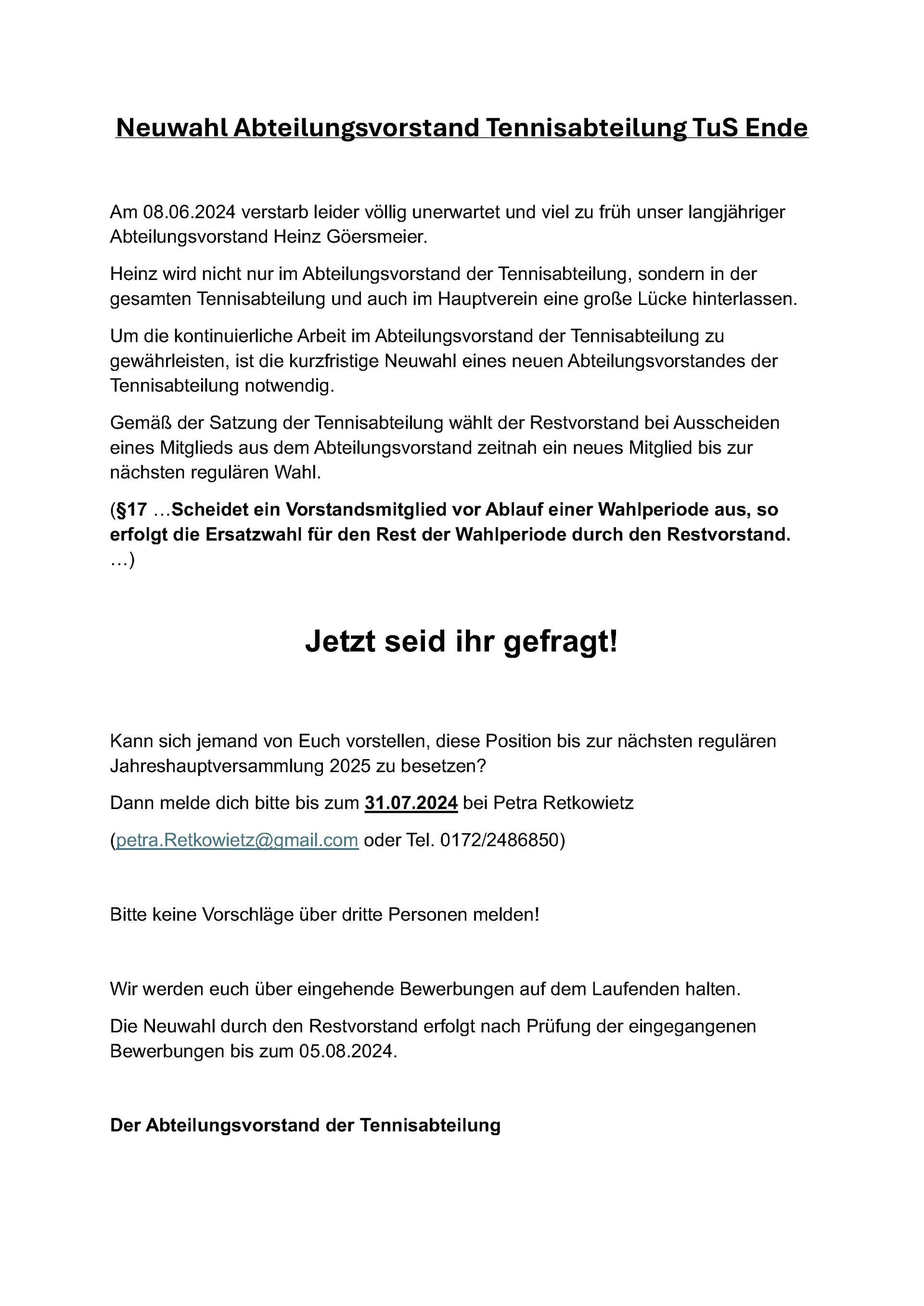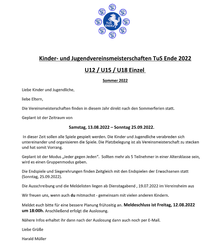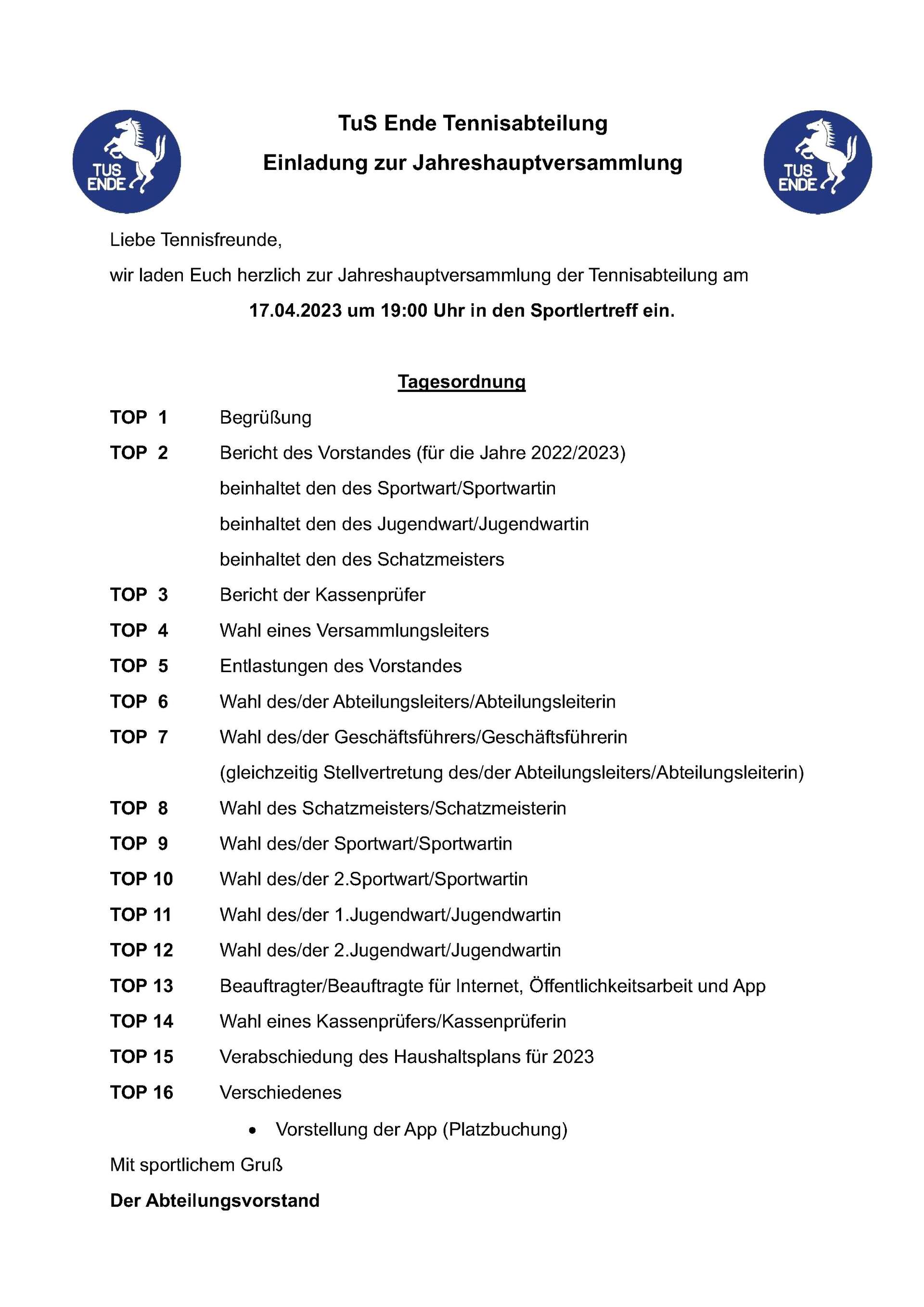 Die Einladung findet ihr im Anhang. Anmeldung bitte bis Mittwoch, 13.09.2023, über die im Tennisraum ausliegende Liste oder per Mail an sportwart@tus-ende-tennis.de.