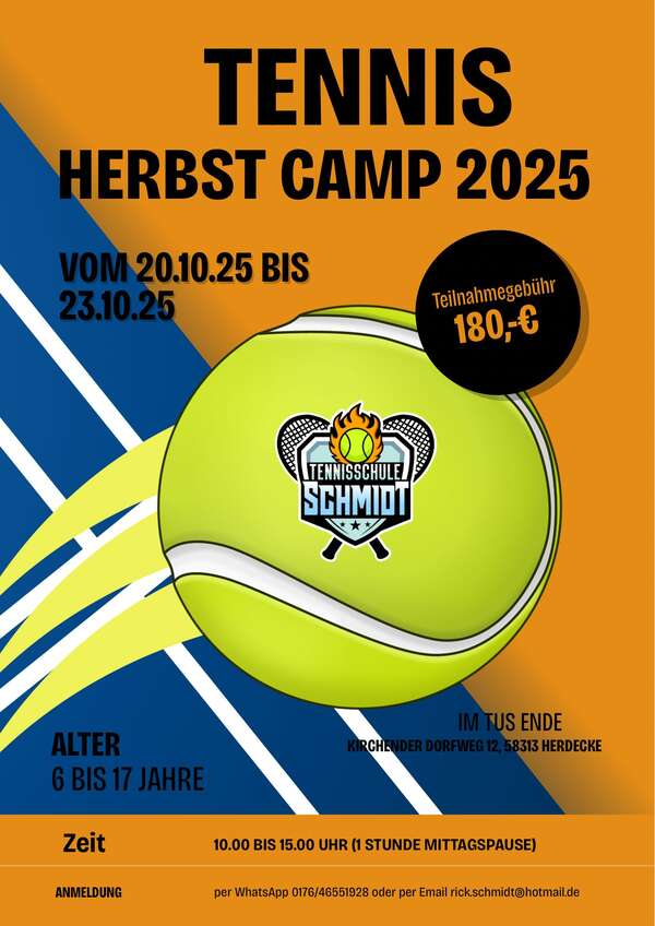 In den Herbstferien findet wieder ein Tenniscamp für die Jugend statt. Alle Infos dazu findet ihr auf dem Flyer. Die Anmeldung ist ab sofort bei unserem Trainer Rick möglich. Sollte wetterbedingt ein Tag nicht spielbar sein, wäre der 24.10. noch ein Ausweichtag.
