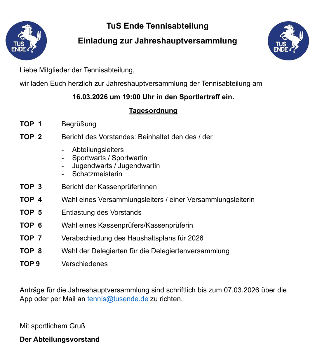 Die Jahreshauptversammlung findet in diesem Jahr am 16.03.2026 um 19 Uhr im Sportlertreff statt. Die offizielle Einladung findet ihr hier im Anhang.